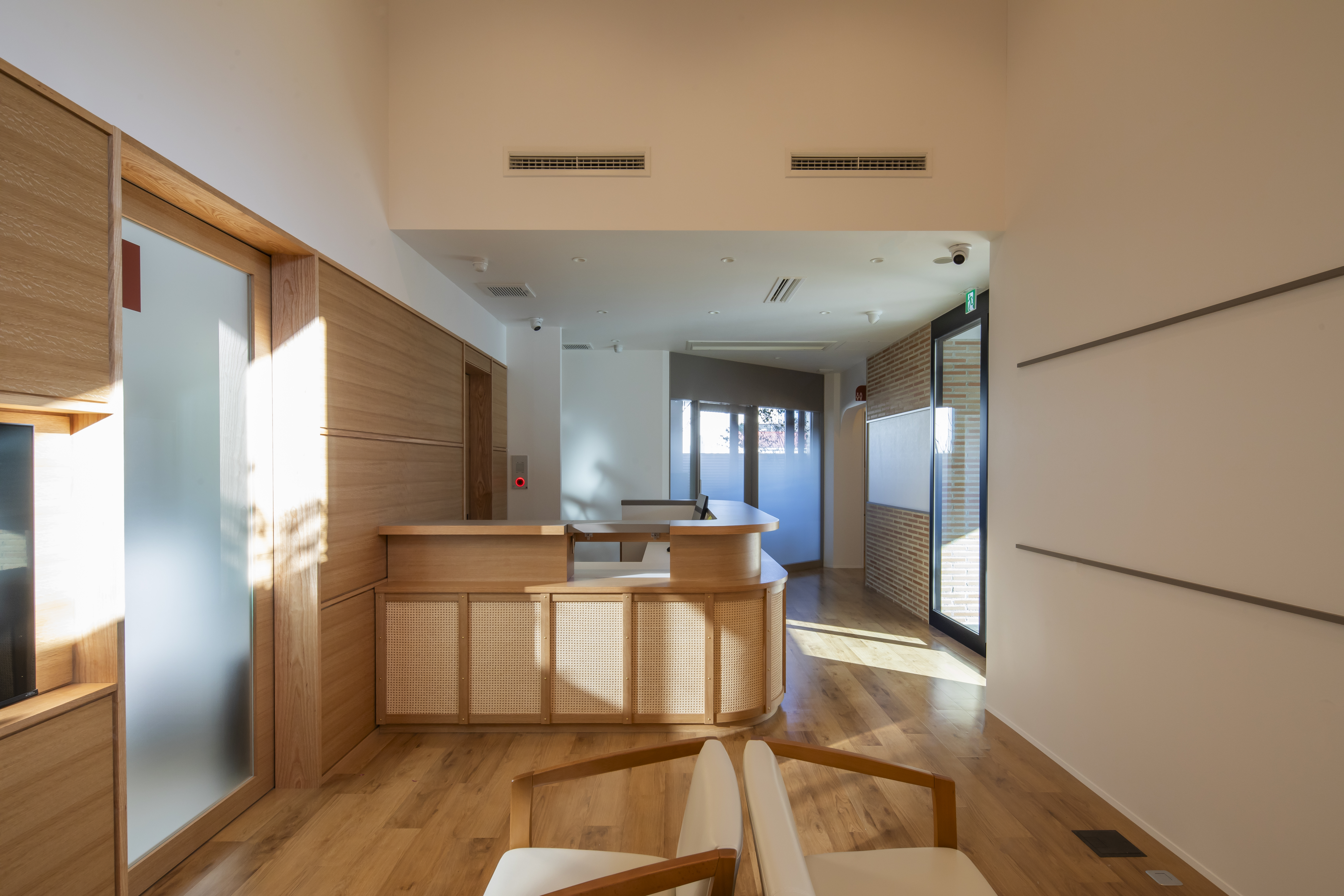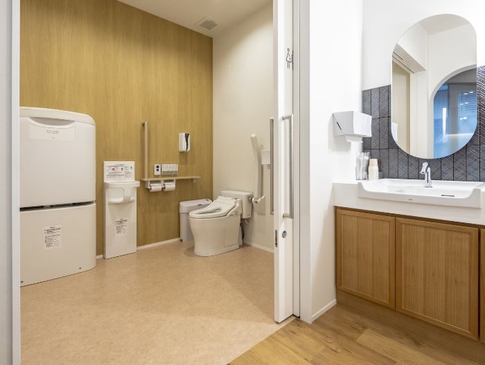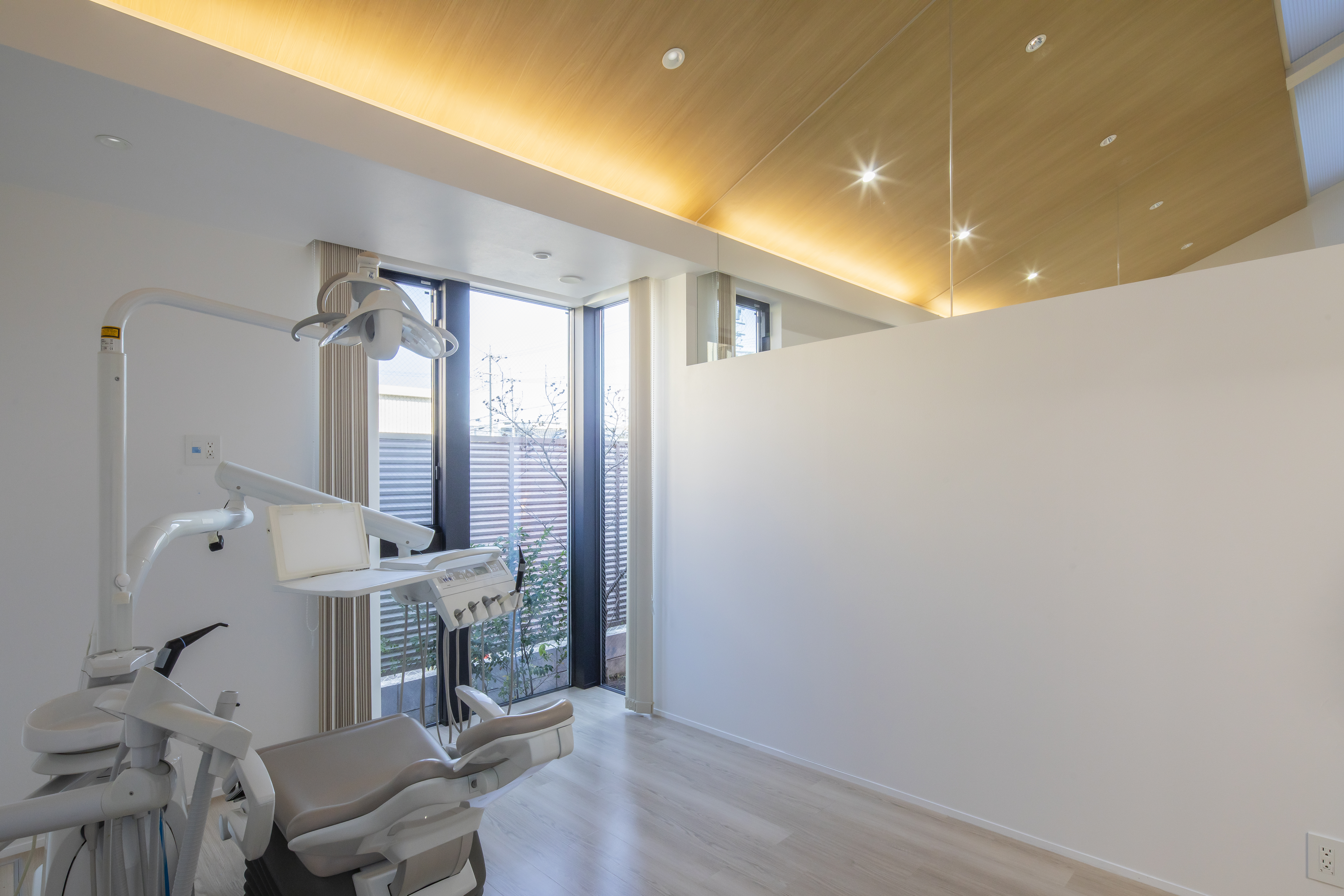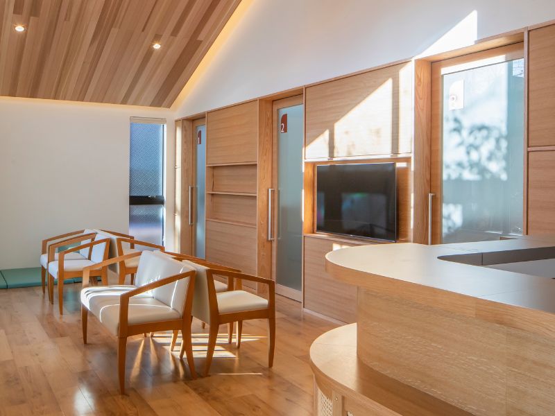 駐車場から院内まで段差のないフラットな構造で、スリッパへの履き替えも不要。車いすやベビーカーをご利用の方もスムーズに移動できます。完全個室の診療室は、車いすやベビーカーのまま入れる十分な広さを確保し、落ち着いた環境で診療を受けていただけます。